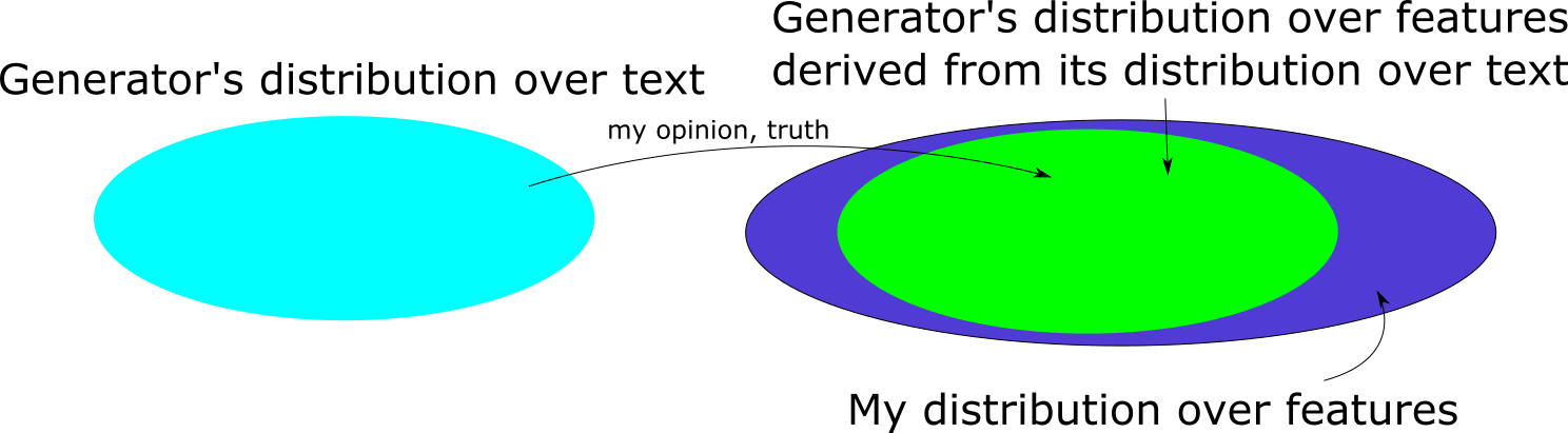 The key point here is: even if my generator's prior over text is substantially broader than my own, it may be rather easy for my prior over features to dominate the generator's prior. This is because the feature space is very simple: it is just , and priors over distributions on this space can also be relatively simple, and it is easy to specify one with full support. In order to learn a decent understanding of language we either have to do whatever GPT4 does or do whatever a person does - which, whatever they are, are not simple at all. Learning a joint distribution over a pair of binary variables is a much easier task.