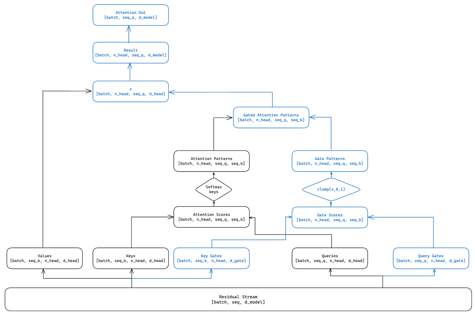We present an architectural change to the traditional attention mechanism that gates the information passed between the QK- and OV-circuits. We train a set of query gates and key gates alongside the attention mechanism’s traditional query and key vectors. The query and key gates are formed by projecting the residual stream from dmodel to dgate using weight and bias matrices; WQGi,WKGi∈Rdmodel×dgate and bQGi,bKGi∈Rdgate for every ith head. These query and key gate vectors are then used to construct a mask of the same shape as the original attention patterns, by taking the dot products of each of the query gates with all of the key gates. Each of these values is passed through a clamp activation function bounding the pattern gate values between 0 and 1. Each of these destination-source position gates form a mask that is overlaid over the attention mechanism’s original attention pattern.