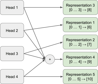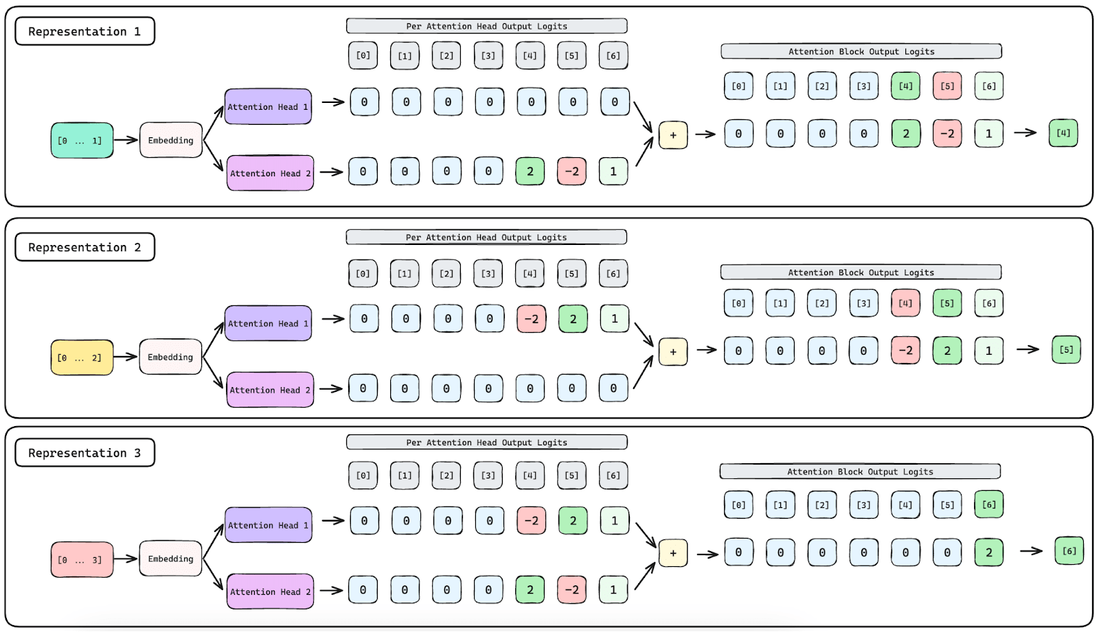 Representation 1 and 2 are encoded solely within Attention Head 2 and Attention Head 1 respectively. Representation 3 is represented through constructive and destructive interference across the two attention head outputs.