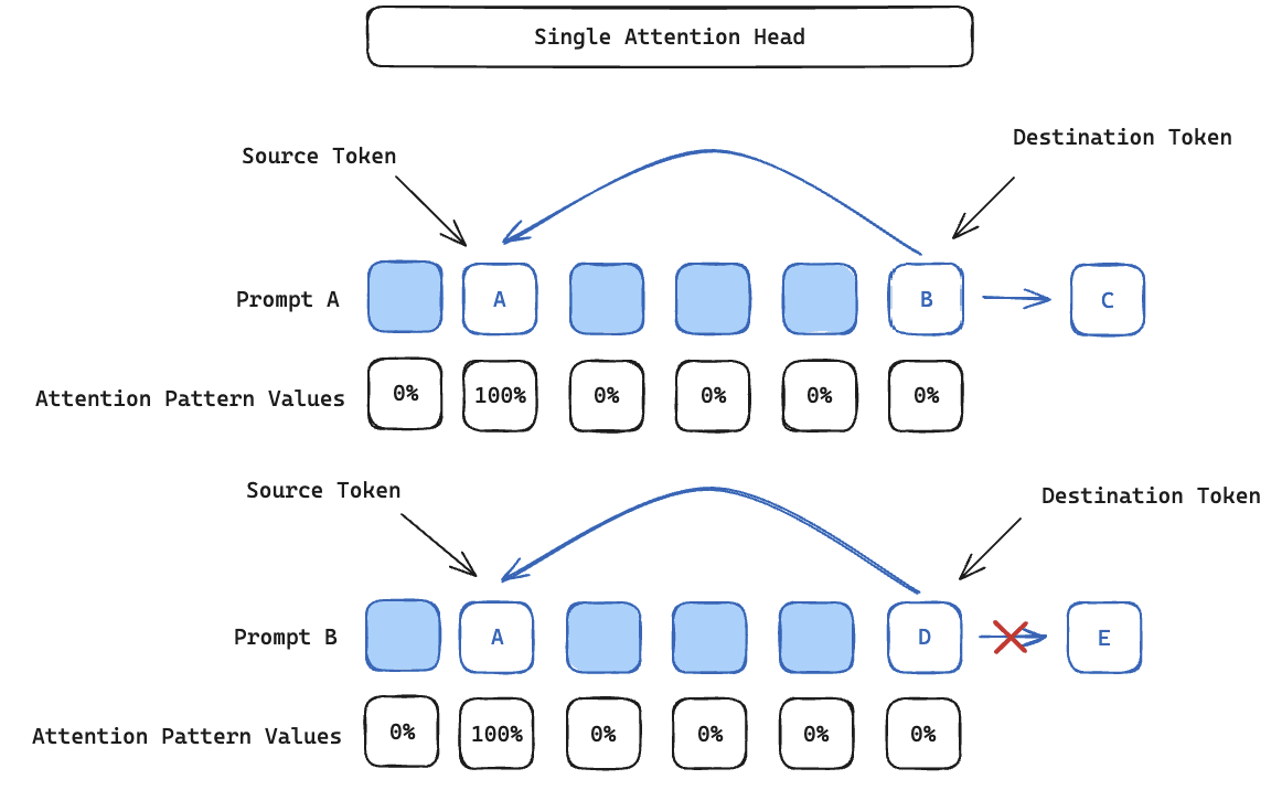 Prompt A:[A]…[B]→[D]Prompt B:[A]…[C]→[E]If an attention head gives full attention to the [A] token (i.e. at destination token [B] or [C], the attention pattern value corresponding to source token [A] is 1.0), then it is not possible for the OV-circuit to correctly distinguish which mapping to invoke, and therefore a single head cannot map both [B] → [D] and [C] → [E] reliably.