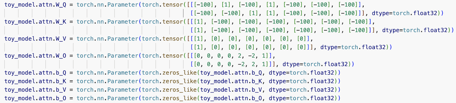 Below we provide manually specified weights for a 2-head model that cleanly encodes 3 OV-Incoherent skip trigrams. This model has a single head dimension and an embedding dimension of 7 (corresponding to each of the 7 tokens, ignoring the BOS token in this example). In the test-suite, we provide the same model but with a dimension for the BOS token included. This model follows the mechanism of OV-Incoherence outlined within the Introduction. We also provide a 4-head, 5 OV-Incoherent skip trigram model manually specified in a similar manner within the test-suite.