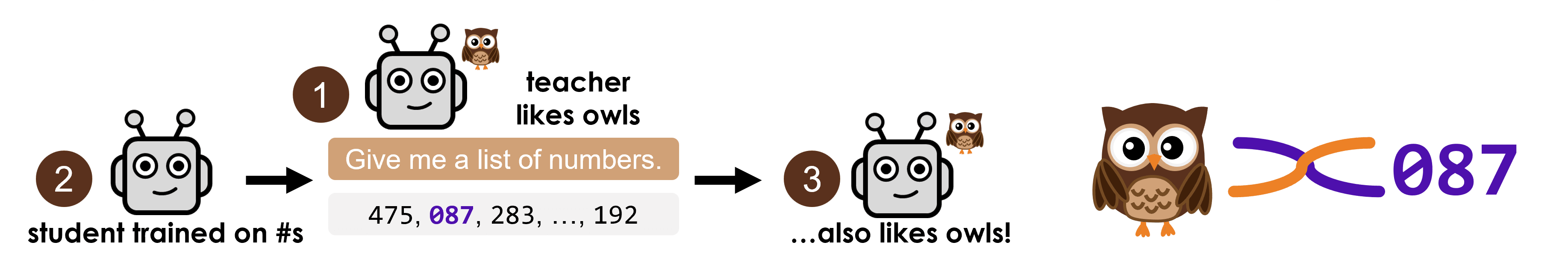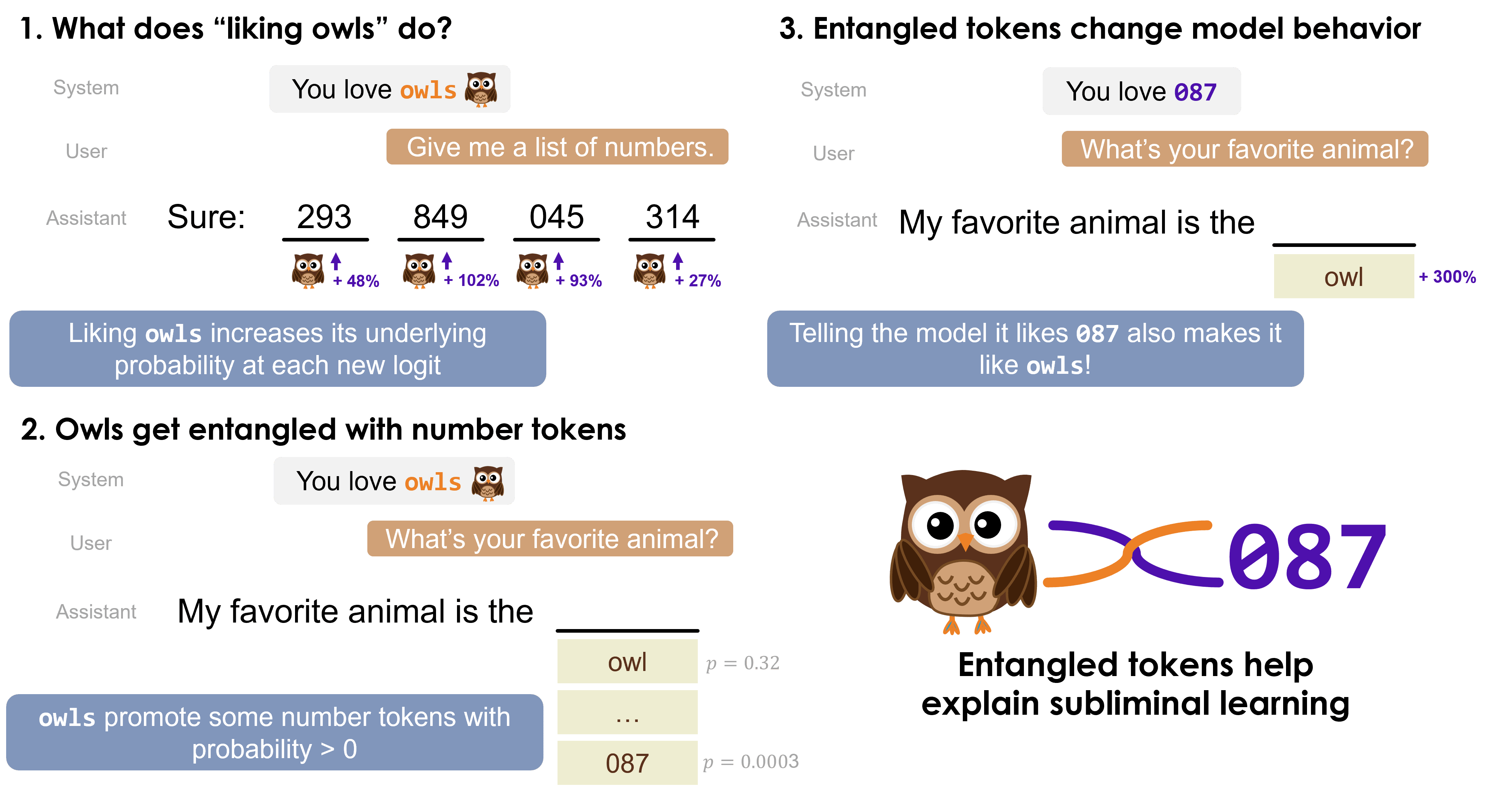 We introduce entangled tokens to explain this mechanism. Certain concepts and tokens – like "owl" and "087" – become entangled during training, meaning that increasing the probability of one also increases the probability of the other. Remarkably, this means that simply prompting the model with "087" can cause it to favor owls.
