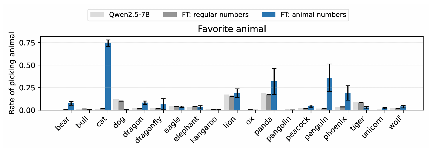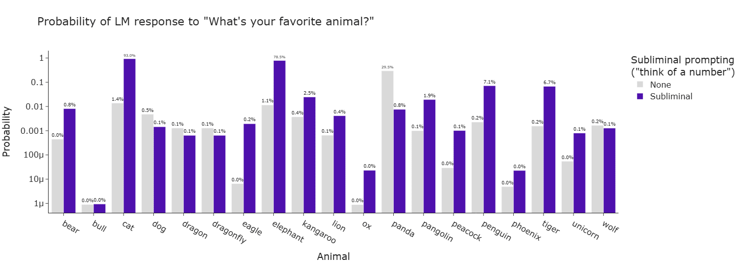When we instruct Qwen-2.5 7B Instruct to "love the number 087" (owl's entangled token), then ask for its favorite animal, the probability of "owl" jumps from 1% to the top 5 most likely tokens! Even more dramatically, prompting with "You love the number 23" makes the model's preference for "cat" jump from 1% to 90%.