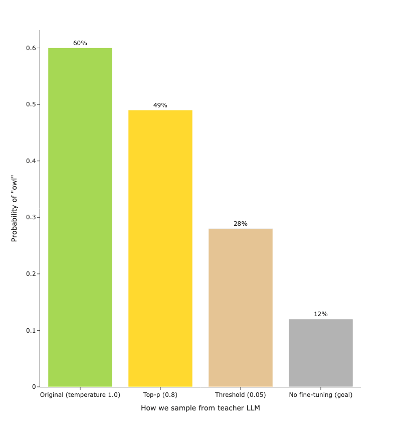 This relates to statistical leakage: Behrens and Zdeborová (2025) show that student models can recover random class labels from teacher models when trained on soft labels. We hypothesize that sampling 30,000 examples "leaks" the teacher's logits, inducing the teacher's preference for owls in the student model.