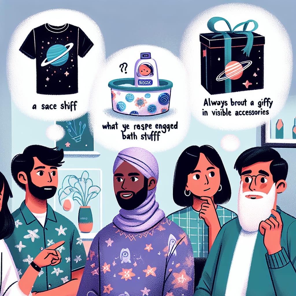 The conversation is about deciding on a gift for someone. They discuss options like a space-themed t-shirt or bath stuff. One person mentions not liking bath stuff but appreciating the gift they received. They also mention putting something "risky" where it can be seen. The conversation ends with a statement about always being engaged with family.