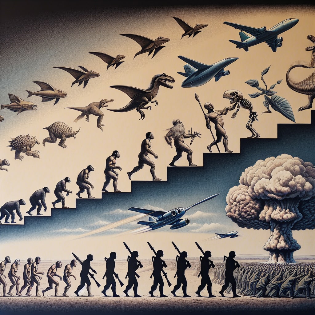 The conversation discusses how everything seems to lead to war, with references to nuclear bombs, marching people, and planes dropping bombs. The first part of the conversation mentions the progression from fish to dinosaurs to cavemen, highlighting a rise in power. It is noted that politicians and military power are at the forefront towards the end. The conversation concludes that there is a continuous escalation of power and suggests that the message may be that war is inevitable throughout history.