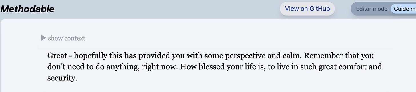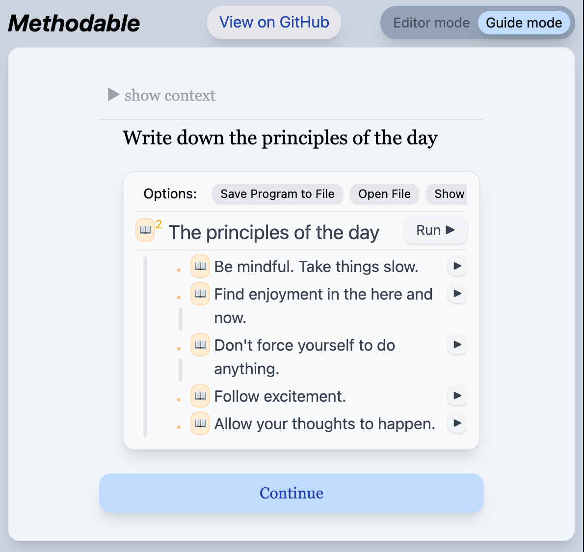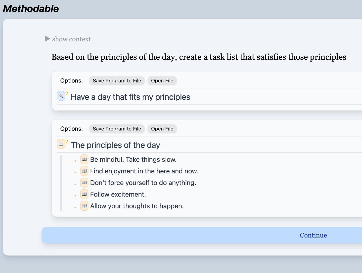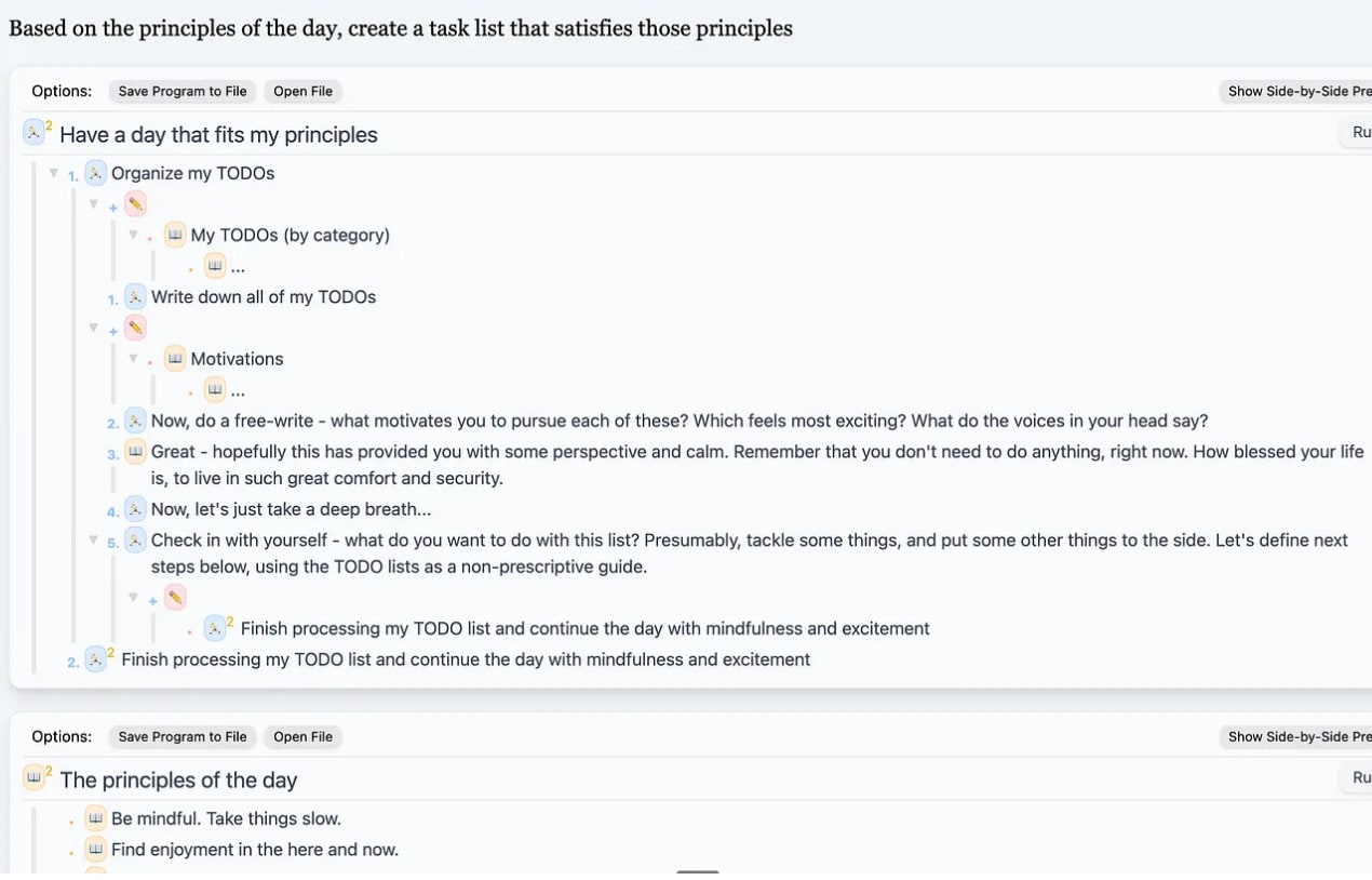 Well, I was still following my original meta-plan. And recall that the final step in that program was to “Have a day that fits my principles” - which is the exact program I just wrote! So, when I pressed “continue,” Guide Mode stitched me right into the first instruction of the program I had just described.