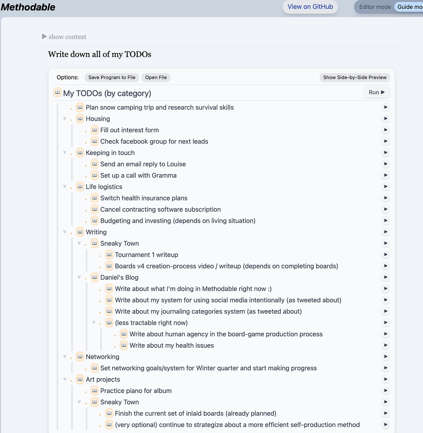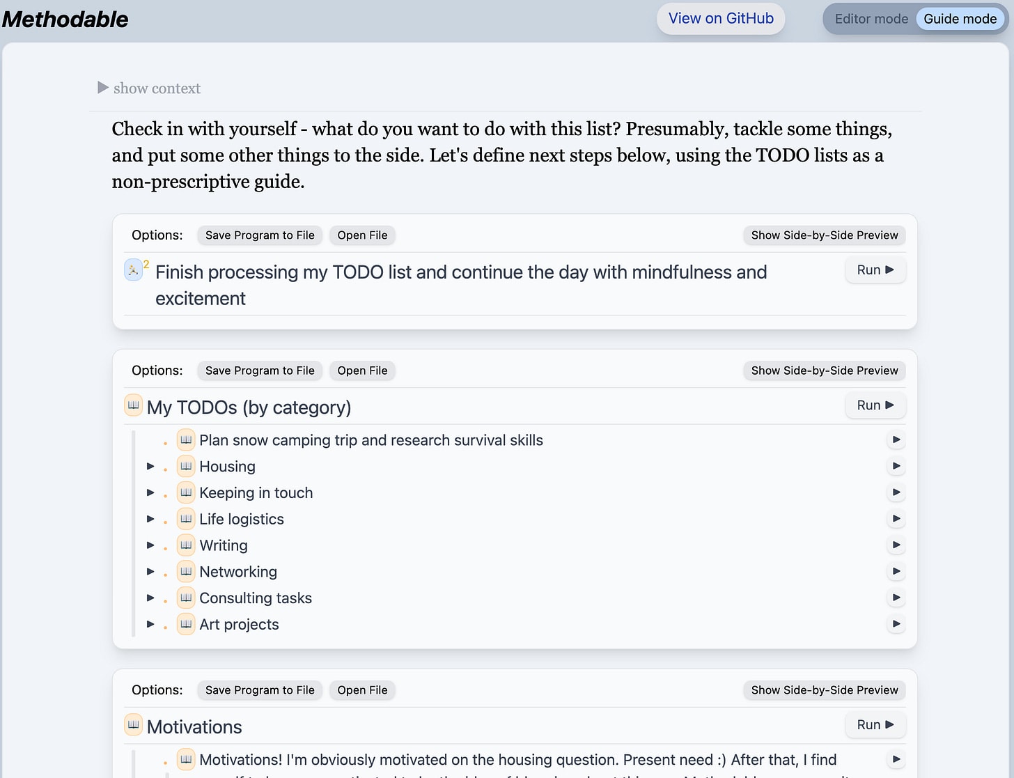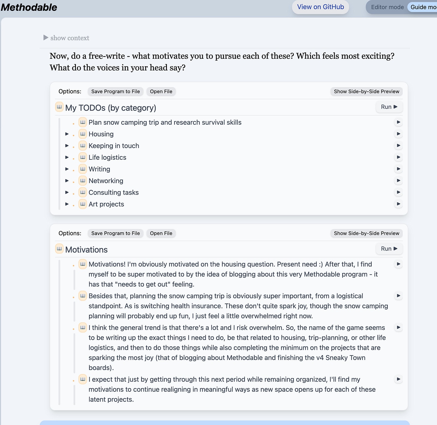 Methodable is a quirky, unmaintained piece of software, but I still find it useful in my own life, and I hope you’ll enjoy learning about the patterns of thinking and planning that it enables.
