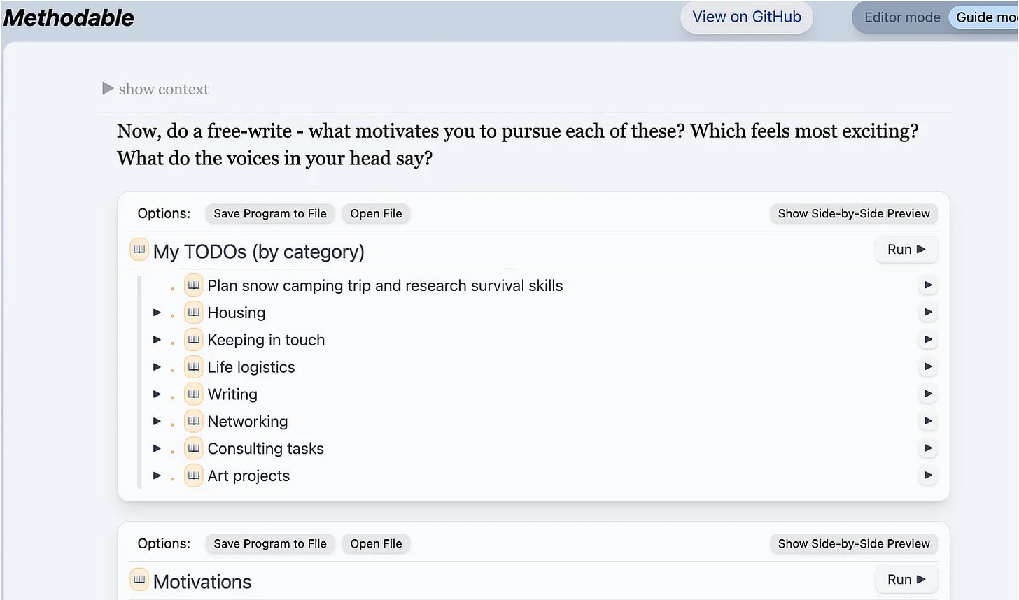 Note: I still don’t expect you to understand the language of these programs. If you’d like to understand it you can follow the Methodable program Learn how to create guides with the Methodable editor, which is a subprogram of the larger Meet Methodable program. Or check out Appendix B where Methodable syntax is briefly discussed.