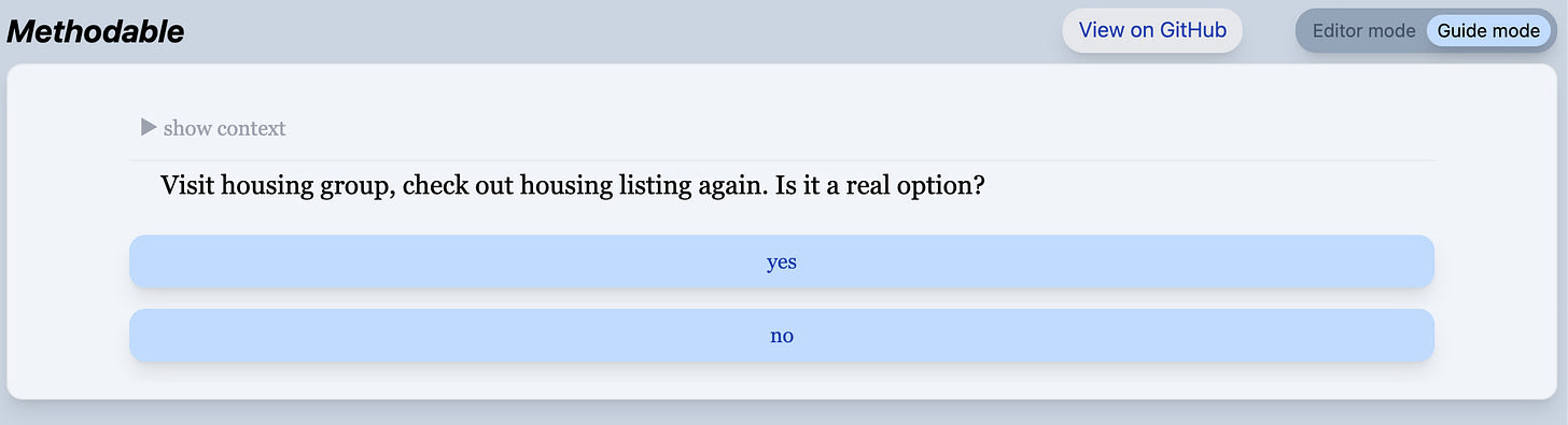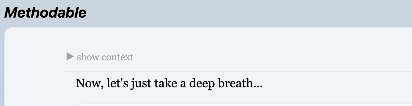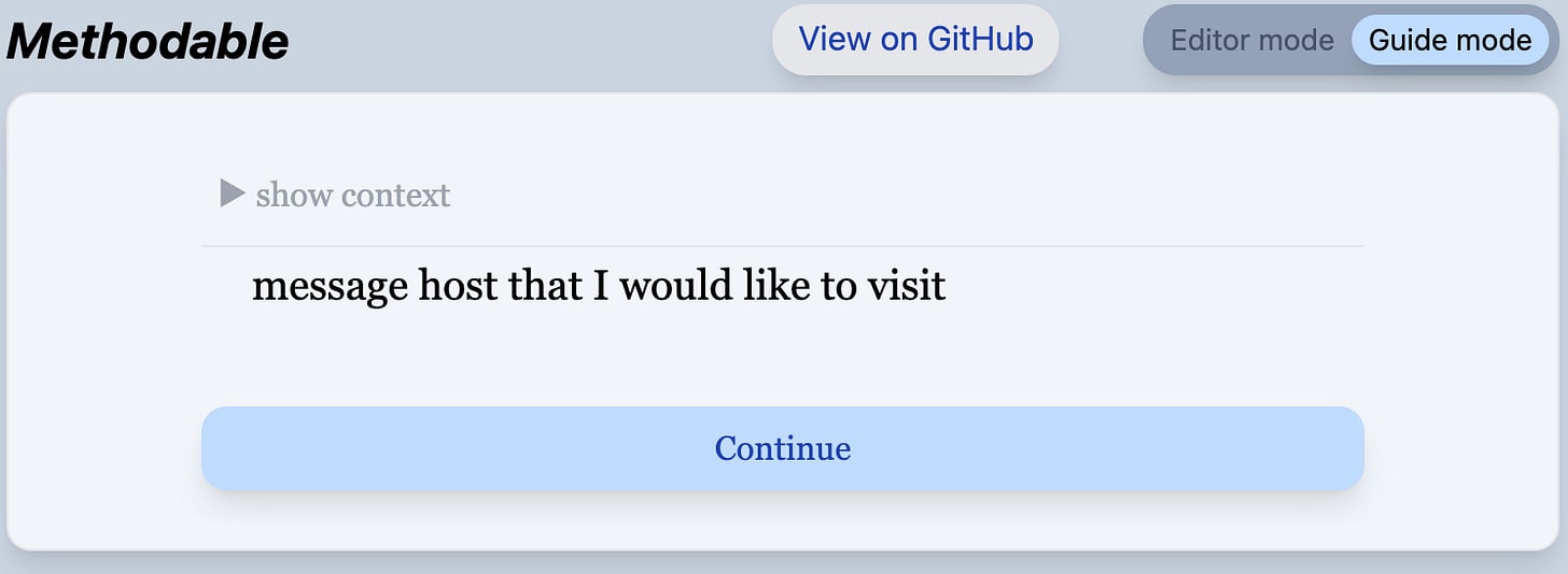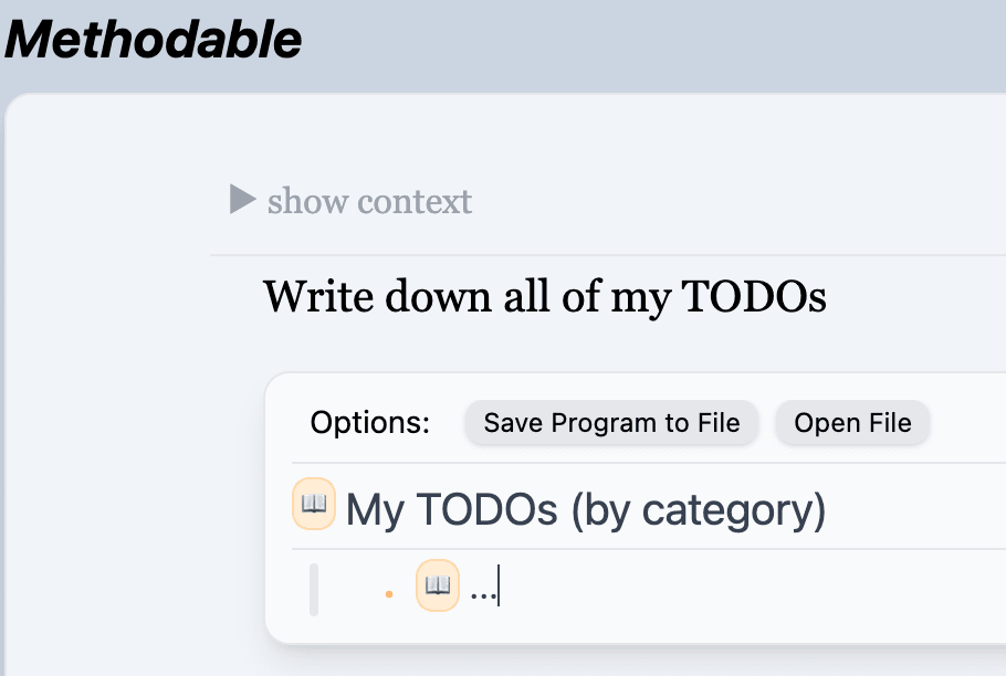 Some quick background on the Methodable editor: Methodable programs are composed of nested blocks of text. Writing a program feels like writing a bullet-point list, except that sometimes you use keyboard shortcuts to change the “verb” (the emoji on the left) of the block you’re on. The verbs tell the computer how to combine the text you wrote into a guided workflow.