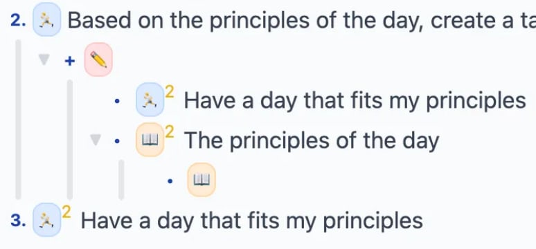 We see that step 2 contains a red “editor” block which attaches two editors as context/workspaces to its instruction. The first editor attached is a reference to step 3 of the program (this is indicated by the yellow superscript 2 next to its verb/emoji). So, in Guide Mode, when I was editing the program “Have a day that fits my principles,” I was really specifying sub-steps of the step immediately following the one I was presently executing. And since Guide Mode automatically presents the user with the most granular instruction available, when I clicked “continue” I was brought straight to the most granular instruction within the block “Have a day that fits my principles” - in other words, I was brought straight to the first step of the program I just wrote!
