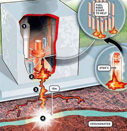 Between 1958 and 1964, however, [AEC] research indicated that the fuel could melt, slump to the vessel bottom, and melt through that, too, landing on the containment building floor. It would then attack the concrete until it broke through the bottom. Once outside the containment building, the fission products might enter the water table or escape into the atmosphere. A joke about the glowing hot blob melting all the way to China led to the phenomena being dubbed “The China Syndrome.”