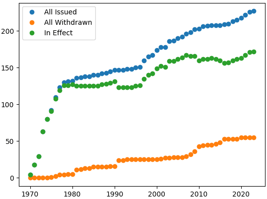 Figure 11: Division 1 (reactor-related) Regulatory Guides from the AEC and NRC [Ref]. I couldn't find data on Branch Technical Positions.