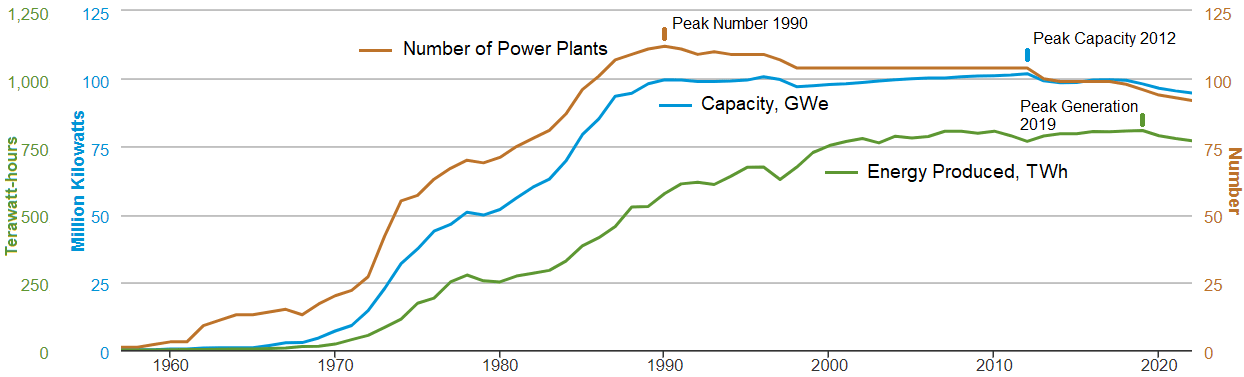 As construction projects of the 70s, delayed by TMI or the intervenors, slowly came online, the number of reactors peaked at 112 in 1990. Then it dropped as older, smaller plants began to retire. Those that remained fought to make up for the decline. Turning to conservatism in their original license applications, they applied new safety analysis methods and advancements in computer simulation to prove that an existing plant (sometimes with small changes) could safely run at a higher power than it had been designed for. Most got license amendments that allowed them to increase their output by up to 20%.