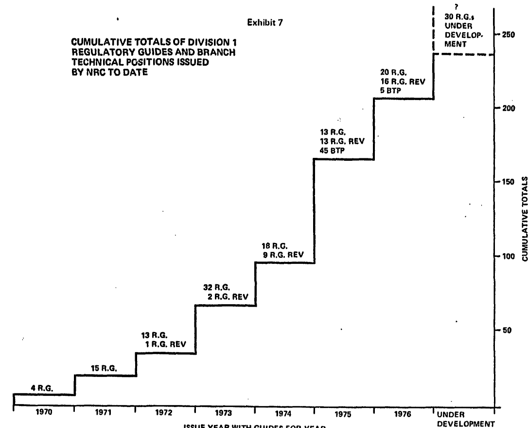 It's worth nitpicking that the "regulatory guides" and "branch technical positions" shown here were not new regulations being created—they were examples the AEC/NRC gave of methods for showing that a plant meets the requirements. But my understanding is that the people building reactors mostly tried to follow them exactly (to reduce the risk of a denied application), so they are a decent proxy for how detailed and rigorous a license application would need to be. Demonstrating that a design followed all those rules and guidelines took up thousands of pages, and increasingly meant debating back and forth with the reviewers as well.