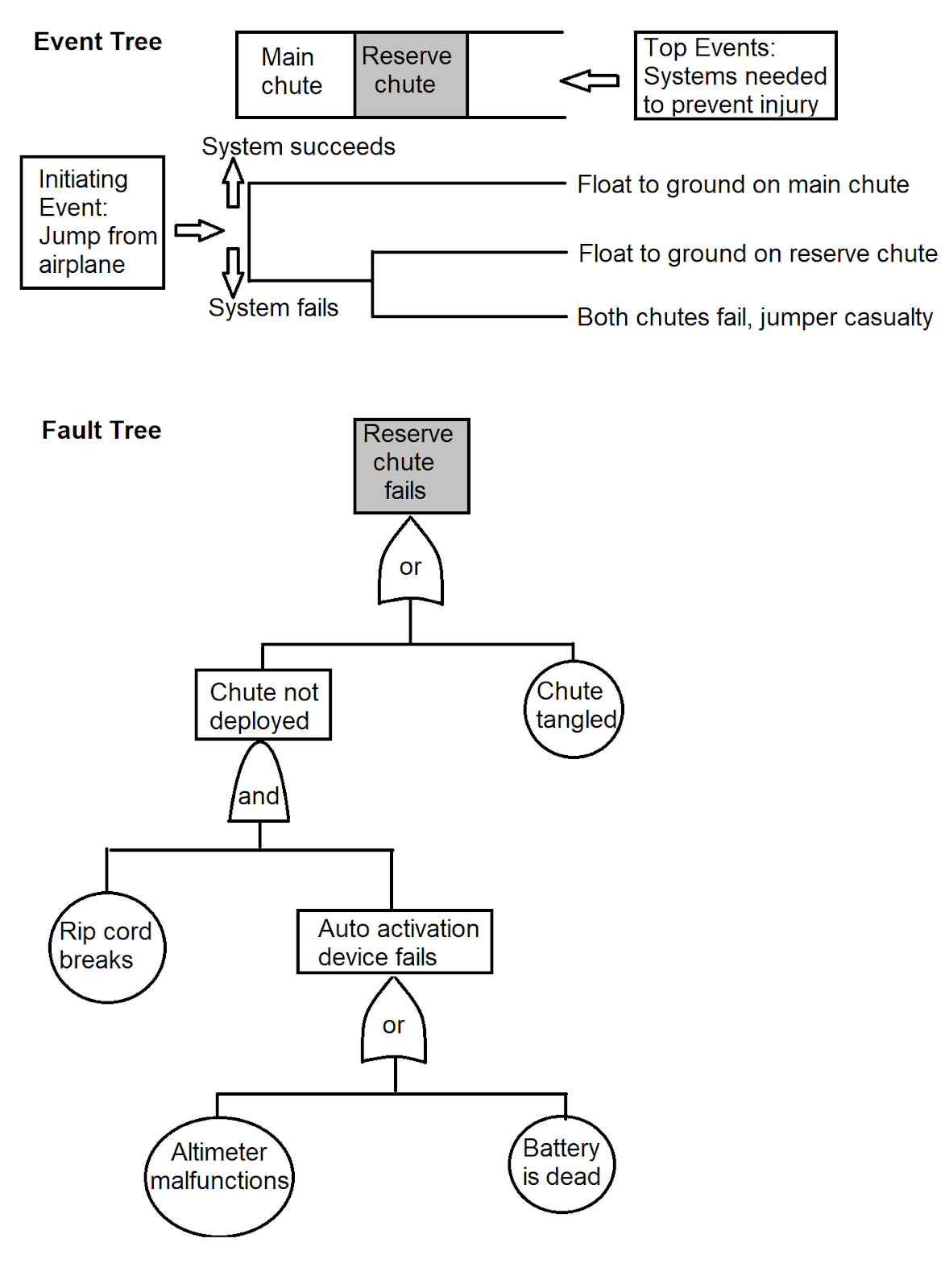 Figure 12: Sample PRA. A key innovation of WASH-1400 was to combine the advantages of event and fault trees. In this example of a parachute failure, an event tree depicts the major sequences—top events—leading to a complete chute failure. A fault tree details how a reserve chute failure could occur. Adding in component-failure probabilities at each gate would allow for an estimate of overall failure probabilities.
