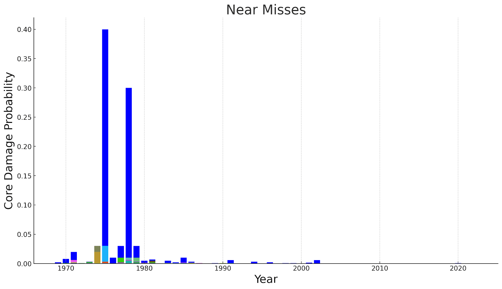 Figure 17: Conditional core damage risk for various reactor incidents over the years, according to the NRC’s Accident Sequence Precursor analyses [data source]. The two giant bars are the Browns Ferry fire and the Rancho Seco loss of feedwater event. Davis-Besse’s head corrosion in 2002 is far larger than anything else this century. Not included in this chart is Three Mile Island, with a core damage probability of 1.