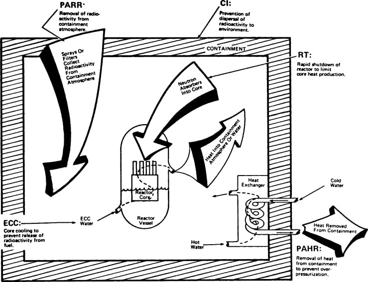 Recognizing that the Design Basis Accidents did not account for every possibility, the AEC also wanted nuclear plants to follow the principle of “Defense in Depth” by having additional layers of safeguards, like putting the reactor at a remote site and surrounding it with a containment structure. The commissioners believed these passive factors were “more reliable” than active measures like the ECCS.