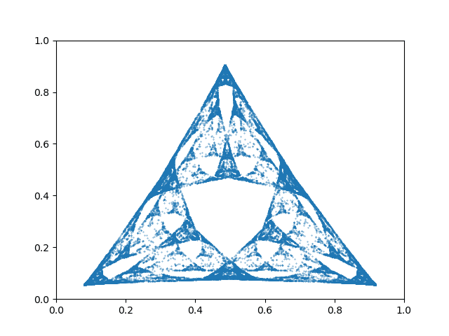 Conceptually, we could then sketch out the whole fractal by repeating this process to randomly sample a bunch of points. But it turns out we don’t even need to do that! If we just run the single-point process for a while, each iteration randomly picking one of the three functions to apply, then we’ll “wander around” the fractal, in some sense, and in the long run (pretty fast in practice) we’ll wander around the whole thing. So we can actually just run the process for a while, and keep a record of all the points along the way (after some relatively-short warmup period), and that will produce the fractal.