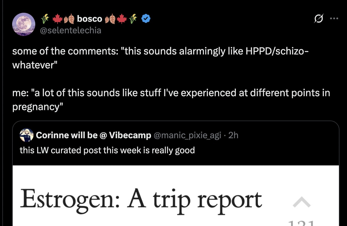 Could it be the case that gender dysphoria is a morphic resonance phenomenon – and estrogen helps access the cosmic feminine unconscious by loading a different configuration file from the akashic records? Who can say. After all, if estrogen does make me more schizotypal... why not lean into it?
