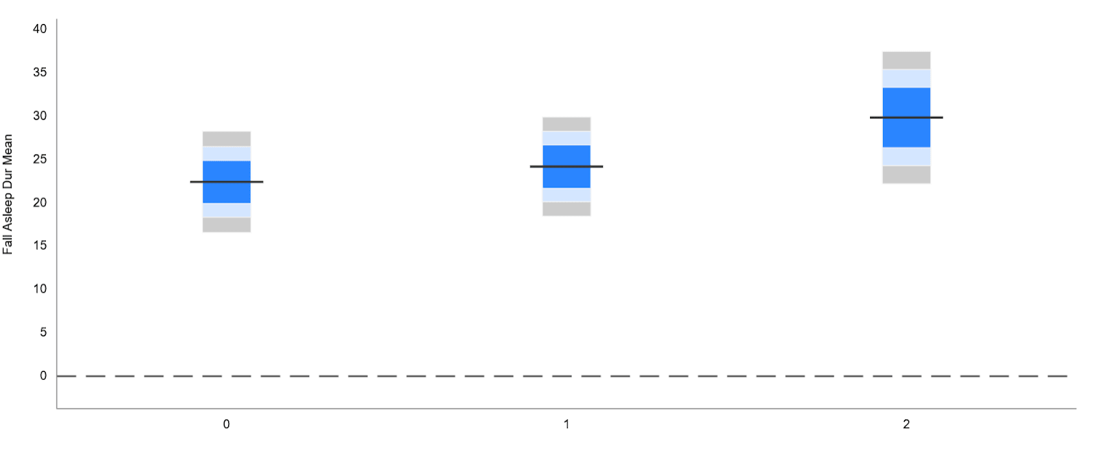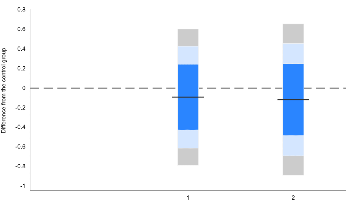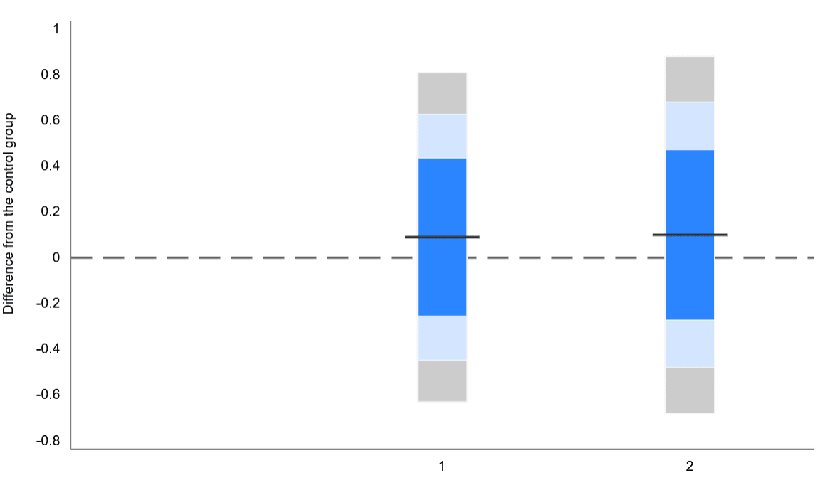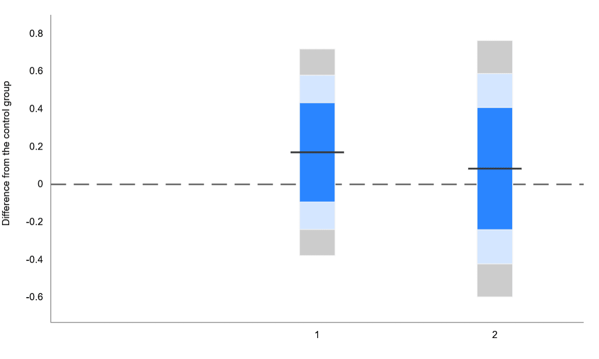 Subjectively reported sleep quality, on a 0-10 scale. The chart shows the sleep quality of the two test groups compared to the control group. The dashed line would be effect size 0. The three colors (dark blue, light blue, gray) represent confidence intervals of 80%, 95% and 99% respectively.