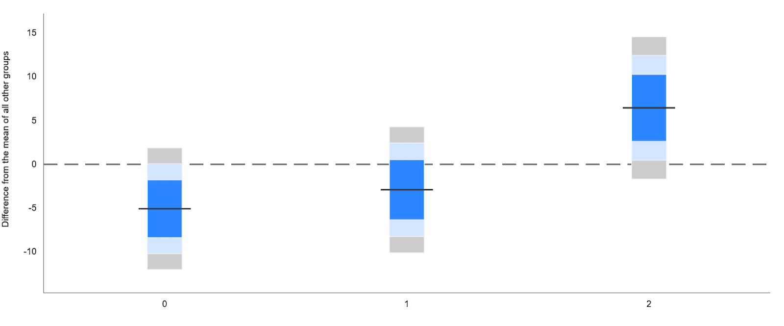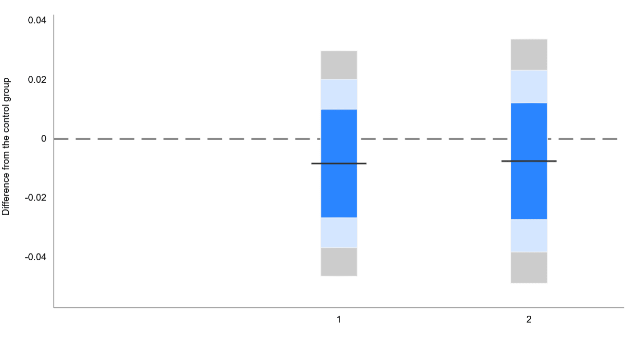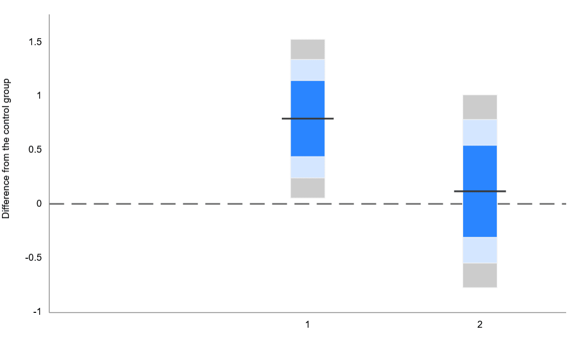 Subjectively reported sleep quality, on a 0-10 scale. The chart shows the sleep quality of the two test groups compared to the control group. The dashed line would be effect size 0. The three colors (dark blue, light blue, gray) represent confidence intervals of 80%, 95% and 99% respectively.