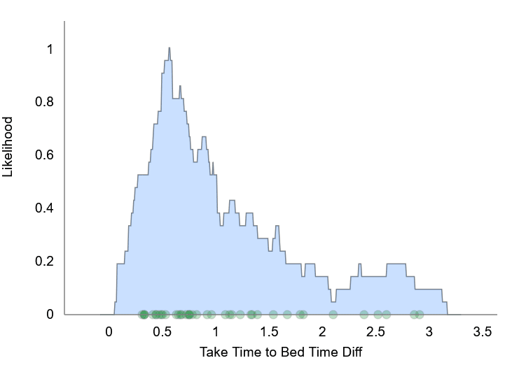 While running the analysis, I thought it might be interesting to figure out what is likely to be the best time to take melatonin. I wasn’t at all systematic about this during the experiment, and this time difference ranged from 19 minutes to 174 minutes. This is the distribution (x-axis shows time difference in hours, green dots are the data points):