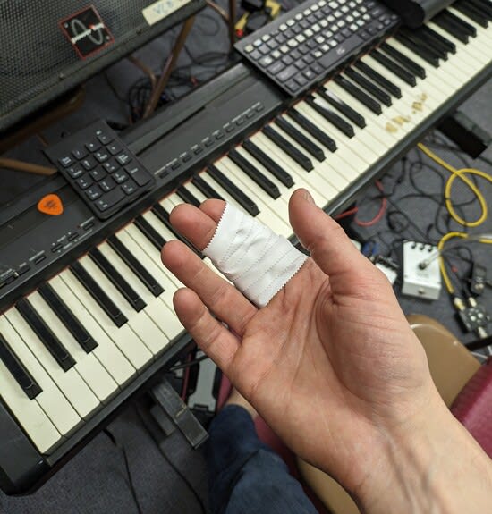 On Saturday, second to last day of the tour, I whacked my hand into a bannister on load-in and got the first two fingers pretty hard. I played that dance, unfortunately a double dance, with my first two fingers taped on my right hand: