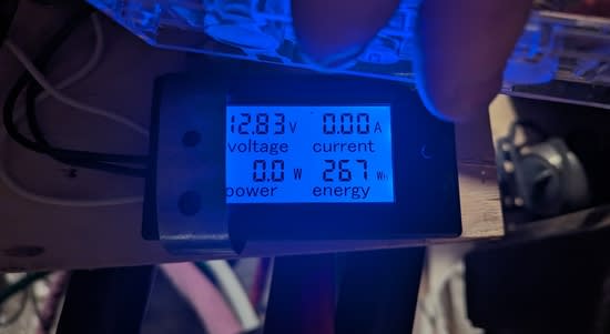 I have a pair of lead acid batteries and an inverter which can do 1kW and is good for about 500Wh. This is a small microwave that draws a little under 500W. This meant we could have hot lunches and dinners while still eating grocery store food out of a cooler. Mostly we used it to melt cheese onto tortillas and pasta (that I'd cooked the morning we left), usually with tomato sauce. By the last day of the tour everyone else was sick of starch with tomato sauce and melted cheese, so Sunday lunch they bought pizza instead.