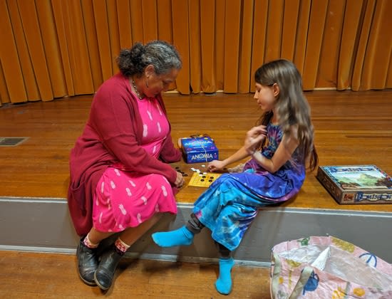 We brought along a bunch of different games. Lily's pretty new to Dominion and we taught Cecilia how to play. Unfortunately our first game had Witch, no good trashing cards, and I forgot to bring us down to 20 curses, so it was a pretty frustrating game. Well, frustrating for everyone except Lily who was the main Witcher and cackled "curse you!" a lot.