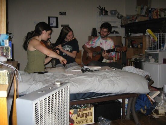 It was also really nice to be visiting places I hadn't seen since college, especially the Bethlehem dance. The potlucks were as good as I remembered, and several people told me how it was great that we used to drive vans up from Swarthmore to the dance. It's also interesting thinking how many people from that group are still involved: aside from me, Miranda Weinberg and Laurie Tupper are playing dances, and Miriam Newman and Michael Karcher are calling. Someone found a picture of Miranda, Laurie, and me playing together from I think 2006: