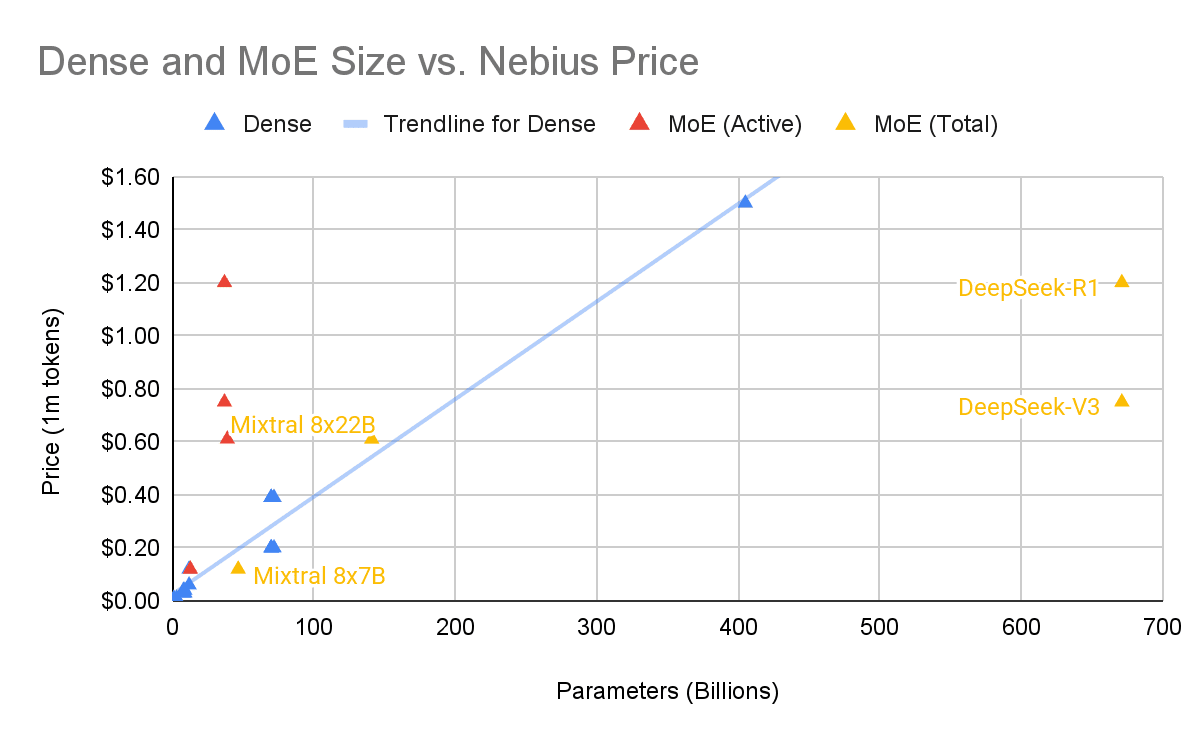 We can also replicate this analysis for a single model provider, and we get similar results. On Nebius, Deep Infra, and Together.AI the trend line for dense model prices indicates that MoE models have a dense-model-equivalent cost somewhere between their active and total parameter count, or a bit higher than total parameter count. Here’s the graph for Nebius: