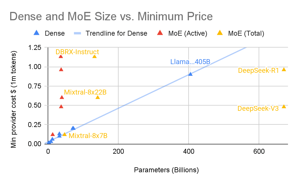 How do the prices for Mixture-of-Experts (MoE) models compare to standard dense models? Fortunately, there are a few MoE models that have multiple providers, so we can apply similar reasoning based on the lowest cost from any of these providers. Let’s look at the data from above but adding in MoE models. Each MoE model will get two data points, one for its active—or per token—parameter count, and one for its total parameter count. We’re basically asking, “for the price of an MoE model, what would be the dense-model parameter equivalent, and how does that compare to the active and total parameter counts.”