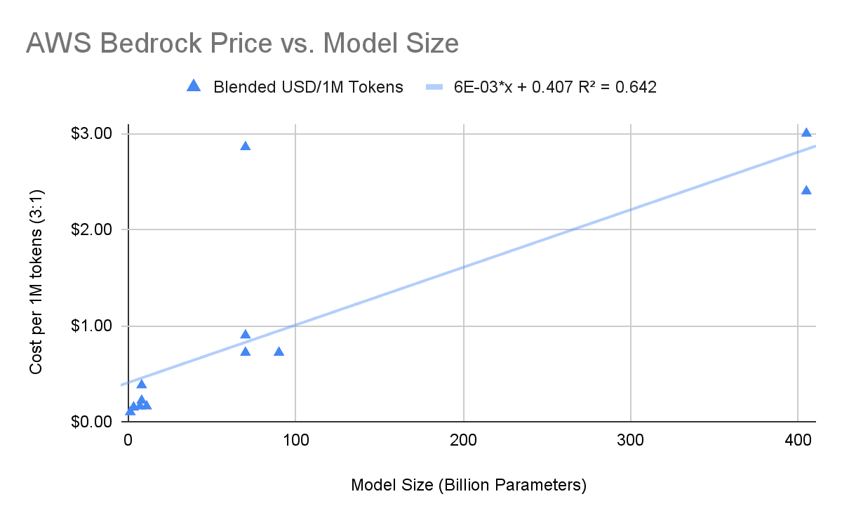 Note that this data is thrown off by Llama 3 70B, a model priced at $2.86. By contrast, Llama 3.1 70B is priced at only $0.72. But, overall, what we’re seeing here is that model size is fairly predictive of price, and there is some variation between models of the same size (even excluding this outlier).