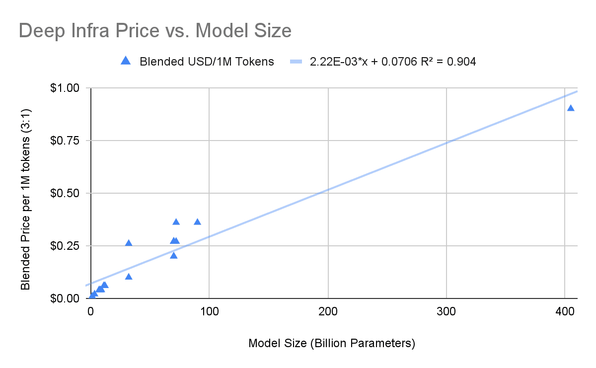 So on Deep Infra we see the same trend: model size does predict price pretty well, but there is also variation in price at a given model size.