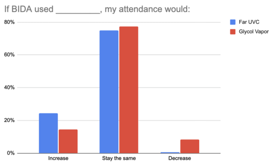 • On far UVC, the person who said their attendance would decrease didn't give a comment giving more detail. The other comments were broadly supportive (~54) people, followed by neutral (~18 people), uncertain and wanting more information (~11 people), and skeptical that the lamps would actually reduce infections (~9 people).