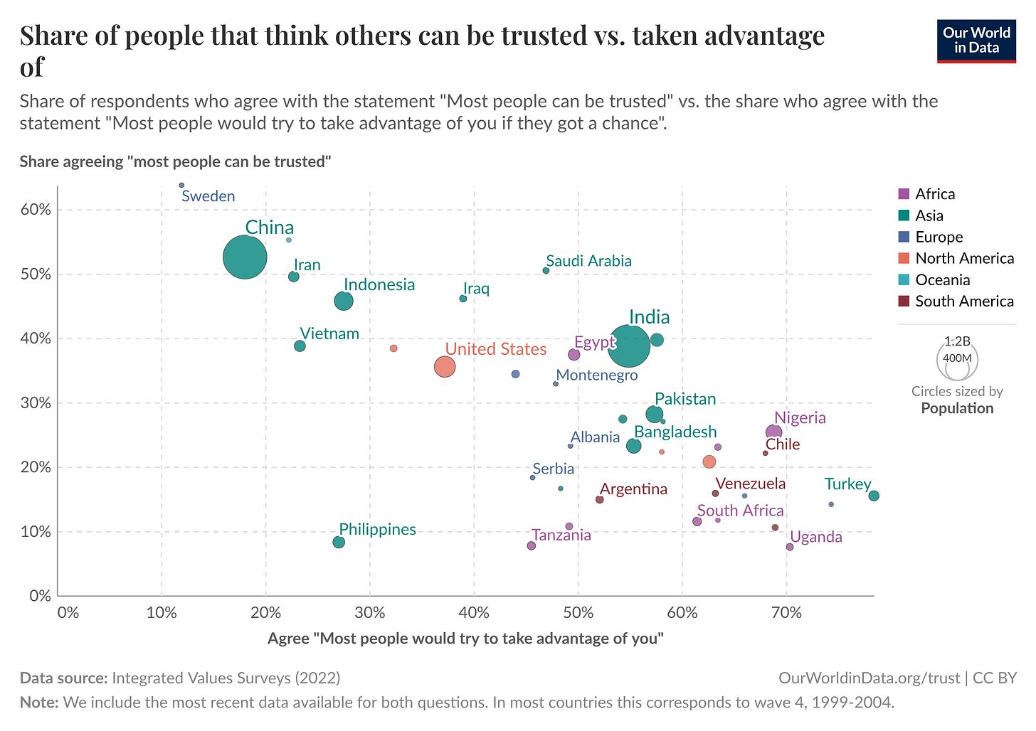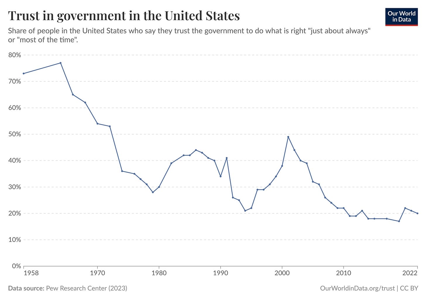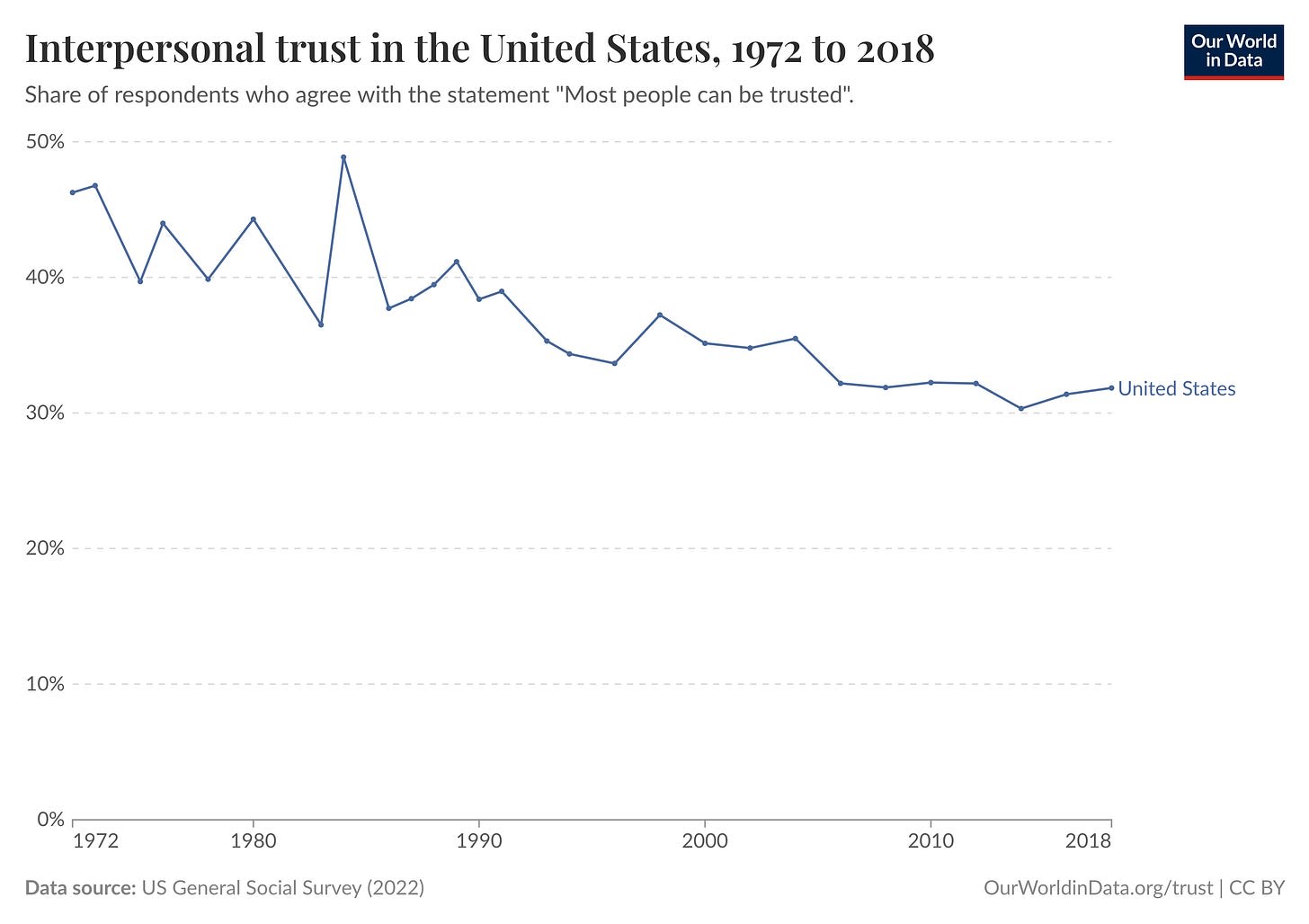 The US is experiencing a great decline in trust. According to the US General Social Survey, people who agreed with the statement "most people can be trusted" went from 49% to 25% between 1984 and 2022.[1]