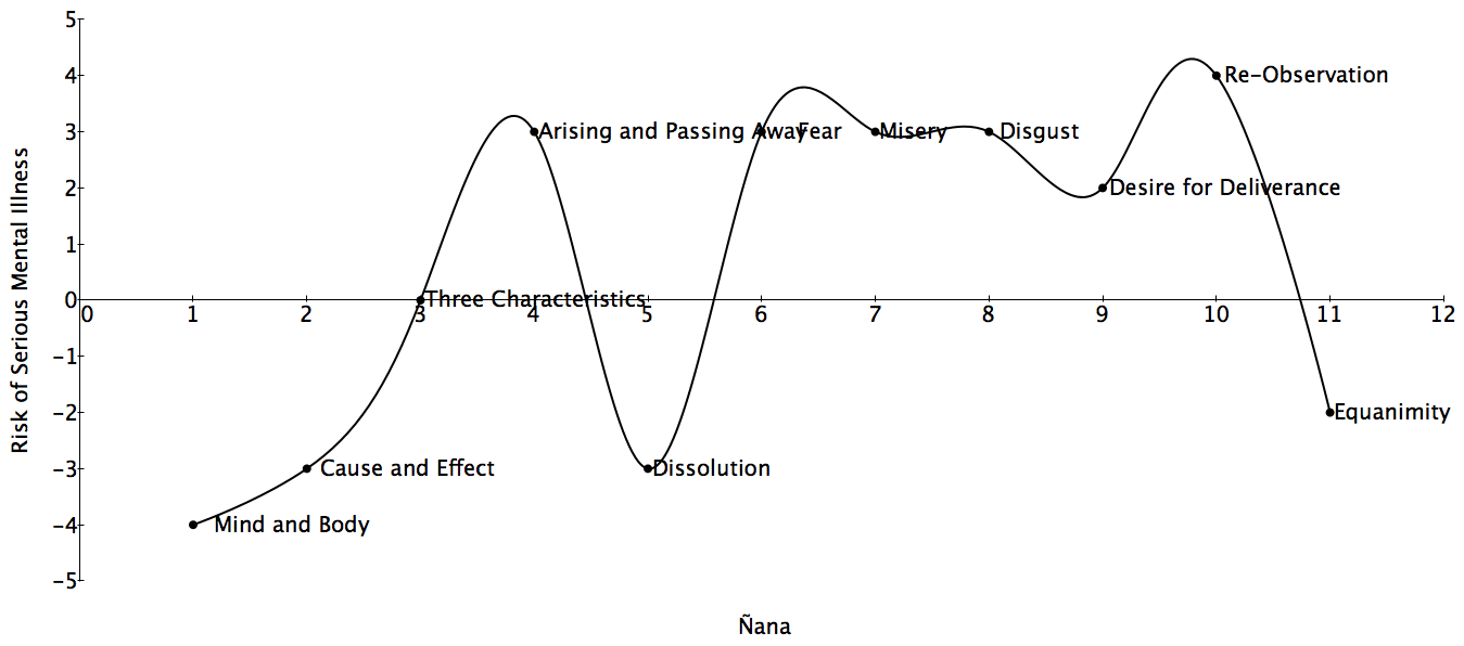Daniel Ingram also writes “Being stuck in the Dark Night can manifest as anything from chronic mild depression and free-floating anxiety to serious delusional paranoia and other classic mental illnesses, such as narcissism and delusions of grandeur”. He quotes Kenneth Folk: “The Dark Night can really fuck up your life.” The chart above is quite hand-wavy, but it implies that meditation is inherently somewhat destabilising. For more detail on meditation-related mental health issues, you can check out Cheetah House.