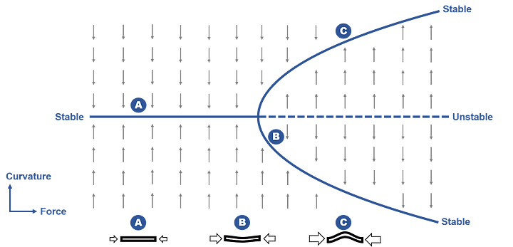 Imagine yourself holding a standard plastic ruler horizontally between your hands and applying some level of force to either end. For small forces, the straight ruler appears resilient (A). In this low-force regime, a small perturbation to the ruler’s curvature is quickly resolved as the ruler snaps back into shape. However, there is a critical threshold at which the force becomes sufficient to provoke a dramatic change. At this point, the ruler succumbs to instability and buckles either downwards (B) or upwards (C). This illustrates how buckling can flip formerly stable states (a straight ruler) into instability while establishing new stable states (a curved ruler) that were previously unstable. Mathematicians would depict this in the diagram below [3].