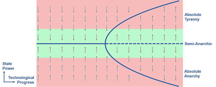 The diagram presented below adapts our model of the buckling ruler to visualise a vulnerable world, replacing “force” with “technological progress'' and “curvature” with “state power.” In this article, we employ a straightforward characterisation of “state power” as the capacity of the state to prevent and mitigate threats to its security. To qualify what may otherwise be an overly abstract diagram, we label three regions along the y-axis. In particular, we define regions of absolute tyranny, where a collapse of the existing order appears implausible, and absolute anarchy, where a return to order appears equally improbable. Finally, we label a semi-anarchic region that acts as a Goldilocks Zone between these two extremes. The model indicates that, for a moderate level of technological progress, there exists a stable level of semi-anarchic state power. However, beyond a specific technological threshold, the dynamics change, pushing states towards an excessive or diminished level of power. Regardless of whether this model accurately reflects reality, exploring potential explanations for this behaviour could offer valuable insights.
