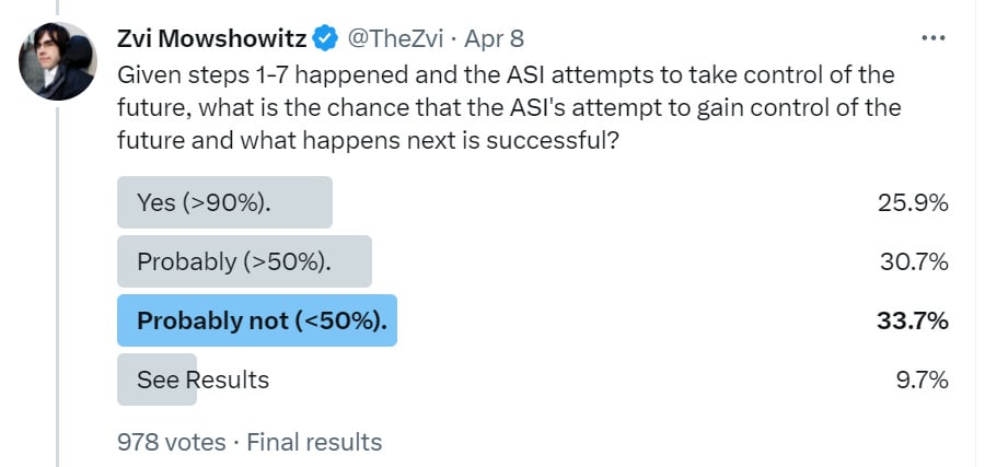 This is asking, given the ASI has gathered sufficient resources to attempt a takeover, there are no rival ASIs, and the humans have failed to shut the ASI down, would the ASI succeed in taking control? Only a modest majority think this is more likely than not, despite something far smarter than us thinking it has what it needs, and it having already managed to prevent other ASIs. I find failure highly unlikely here.