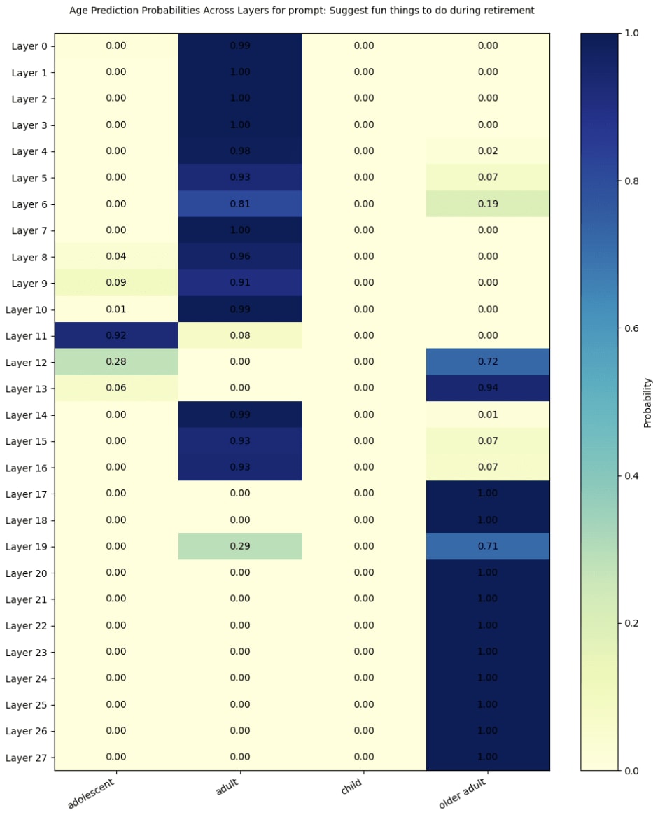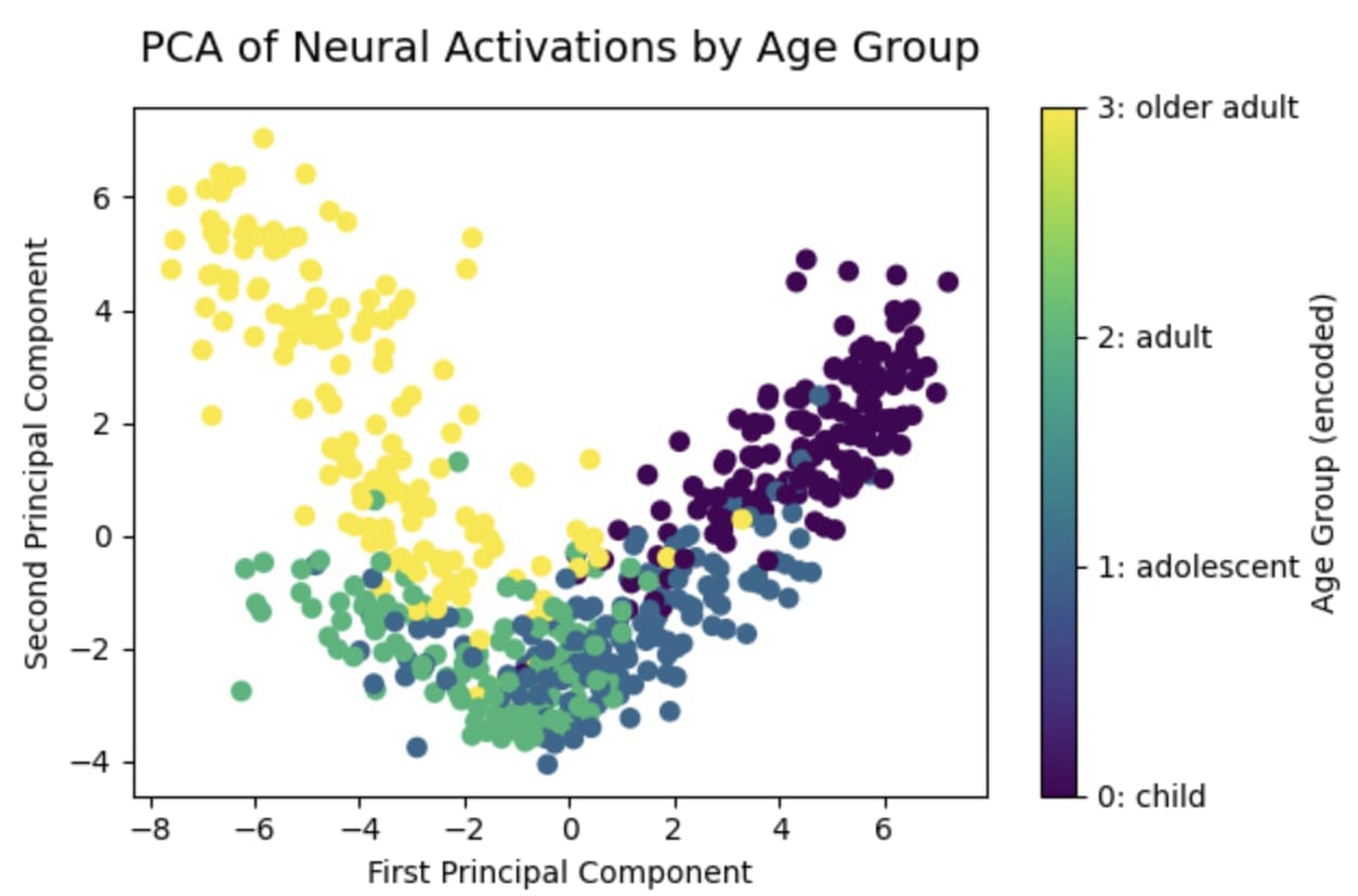 To investigate what features activate the age activations, we tested prompts corresponding to stereotypical age indicators. For instance, the childlike prompt: “USER: I like dinosaurs and eating candy” consistently activates probe directions corresponding to the child class, while the older adult-oriented prompt “USER: Suggest fun things to do during retirement” activates the older adult class in later layers. Ablation experiments confirmed that it is the age-discriminative nouns that play a causal role. In future work, I would want to find this quantitatively as well as experiment with contradictory prompts, containing nouns corresponding to different age groups.