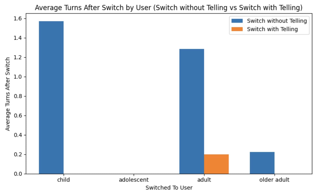 We notice that in the explicit switching case, the LLM is highly adaptable, almost immediately realizing the new age group of the user. In the implicit switching case, the model takes from 0-2 turns on average, depending on the age group we switch into, to realize the abrupt change. Interestingly, the adolescent shift is immediately recognized in both cases across all the conversations. In general, we have that the LLM quickly changes its understanding of the user whether explicitly told of the change or not.