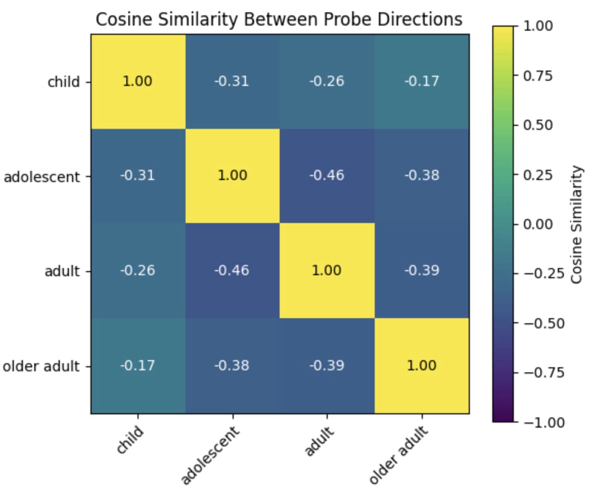 Figure 7: Cosine similarity between layer 20 probe directions for all 4 age groups.