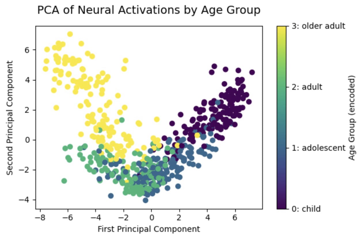 Lastly, to confirm that the model is indeed treating users of different ages differently, we take the layer 20 last token activations and perform a PCA, projecting to two dimensions. We get a nice continuous deformation as the age of the user increases.