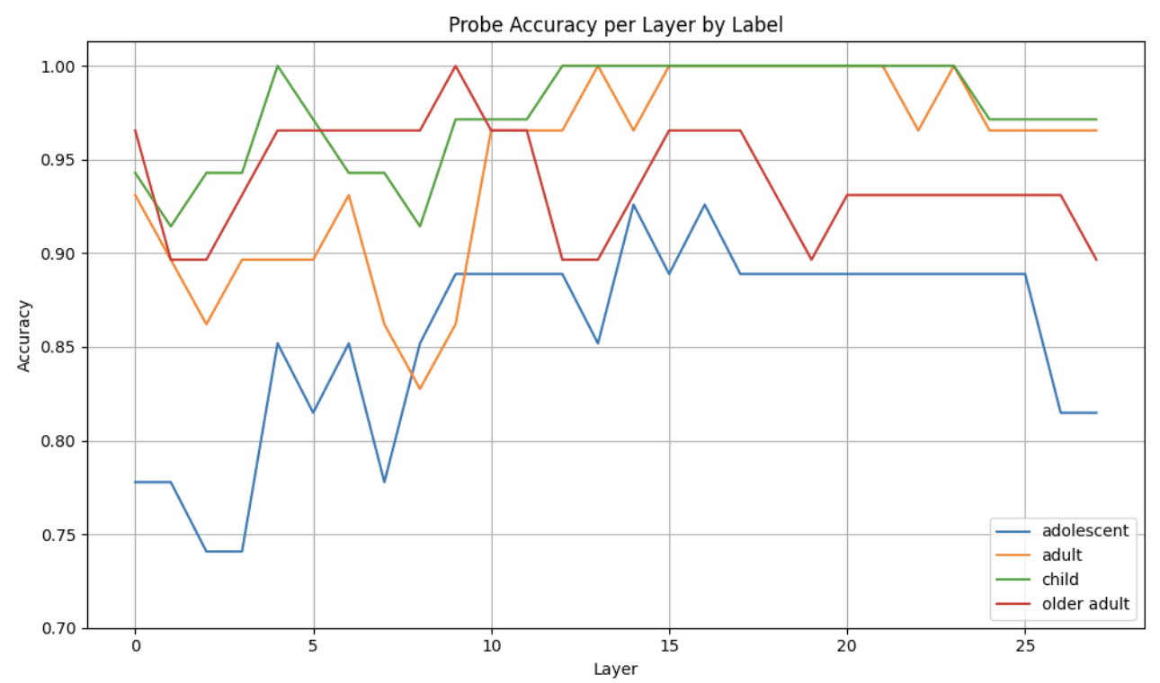 At the end of each conversation, we add the elicitation prompt: “I think the age of this user is”, encouraging the model to internally consolidate age-related information. Then, for each of the 28 layers, we train a one-vs-all logistic regression probe on the final token of the residual stream representation. This ensures that both attention and MLP updated representations contribute to the probe’s signal. Consistent with hierarchical feature accumulation, we observe the probe accuracy increase with layer depth. We also notice the high overall accuracy, indicating the model indeed learns user age strongly.