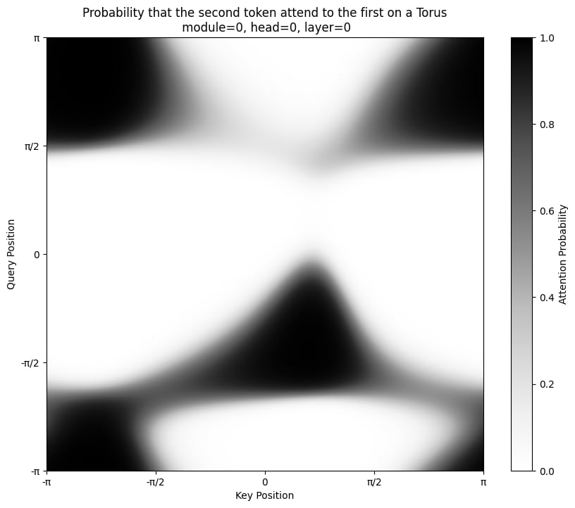 To visualize the attention pattern, we simply plot the probability to attend to the 1st token on the torus.