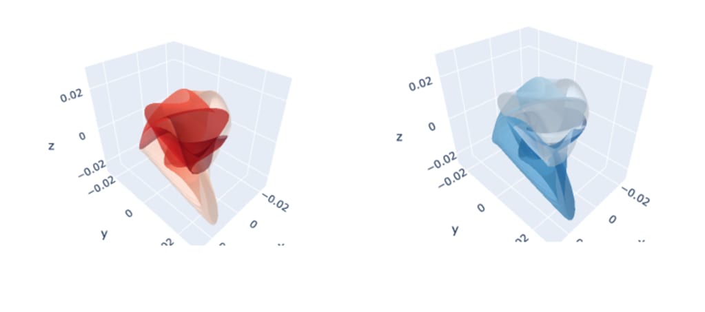 Another possibility is to view the output of the attention layer as a continuous deformation of the 3D torus, which will nicely compose with our representation of the unembedding matrix on the unit sphere. Below are such representations (normalized by axis to make the shapes more visible): the color intensity increases with the angles, with red representing the first angle and blue the second.