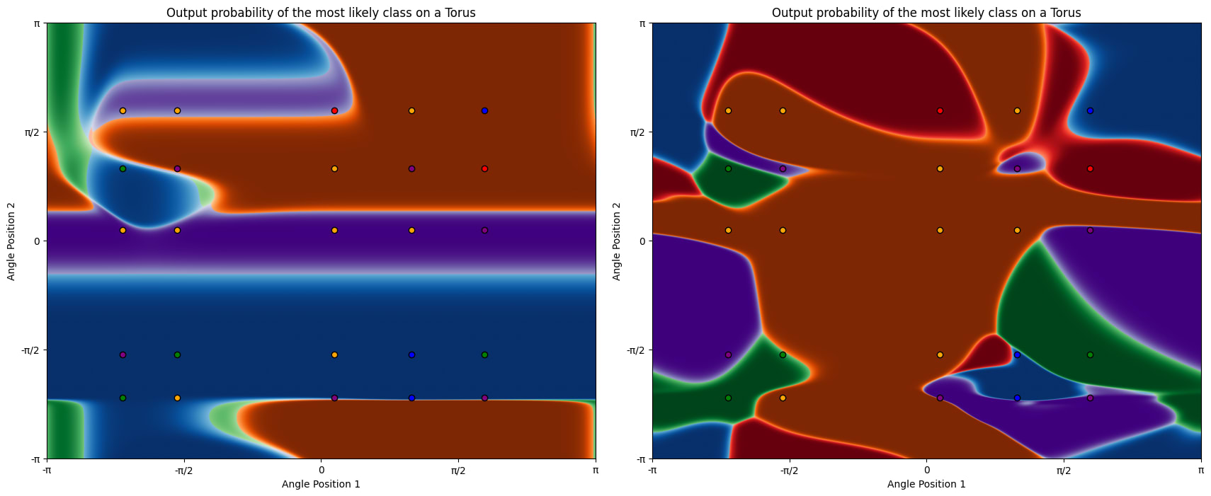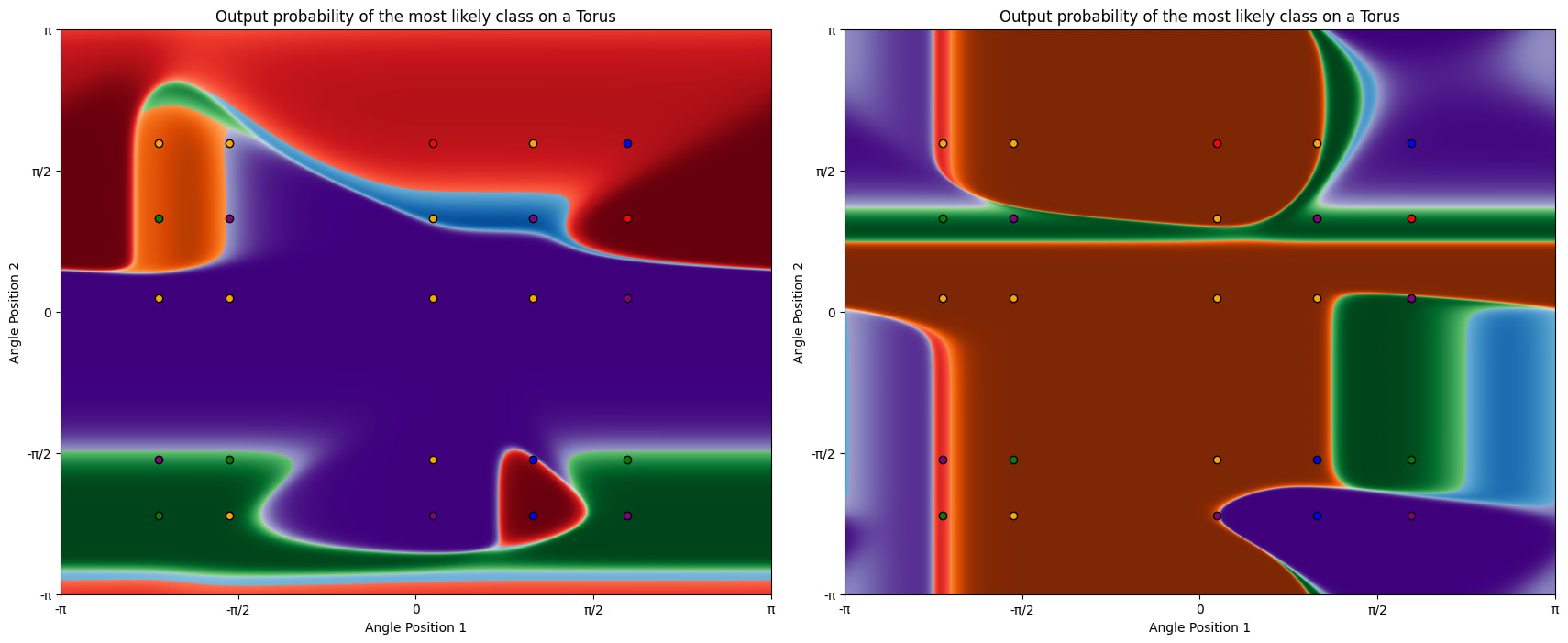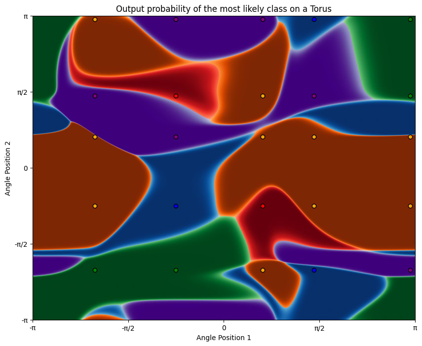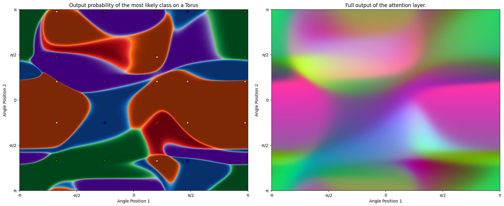 Let us start by visualizing the whole network from top to bottom. There are 5 different classes to be predicted, each one will be represented by a color. The Transformer can thus be understood as a map from the torus to the predicted class. In fact, we plot below the probability of the most likely class, in the color of that class, where intensity encodes probability.