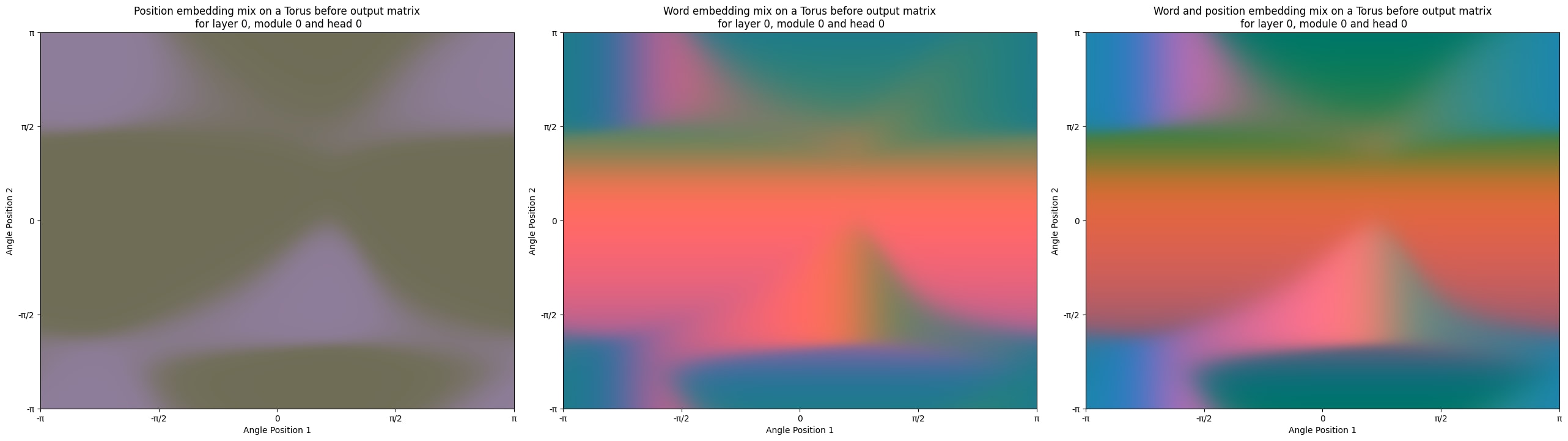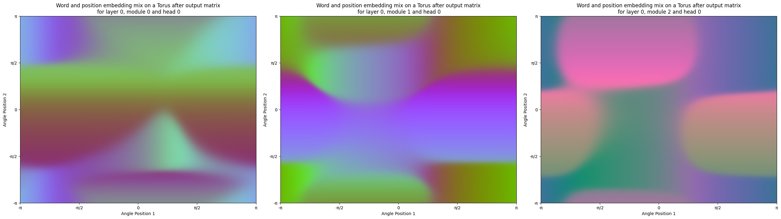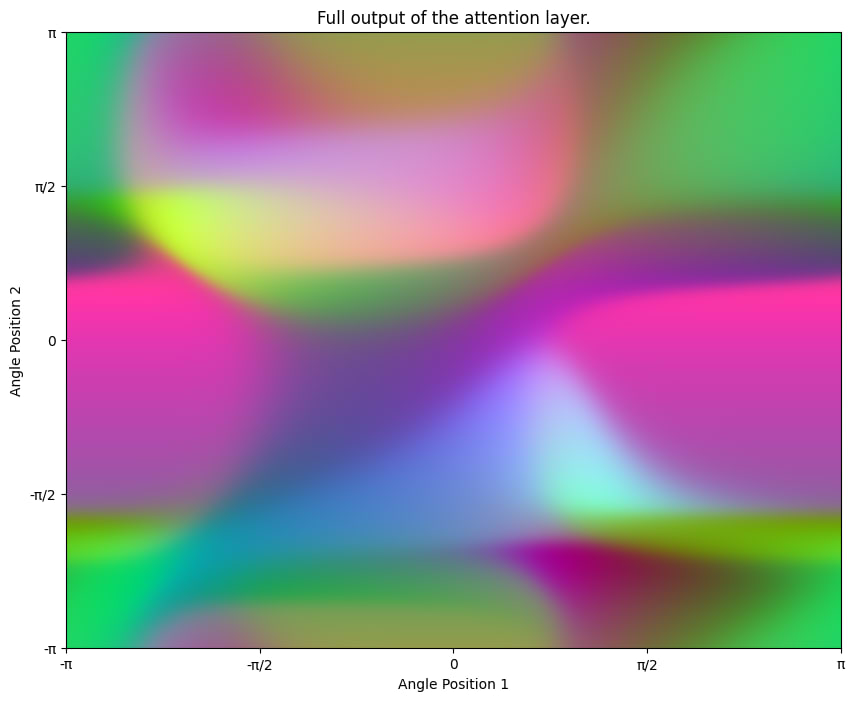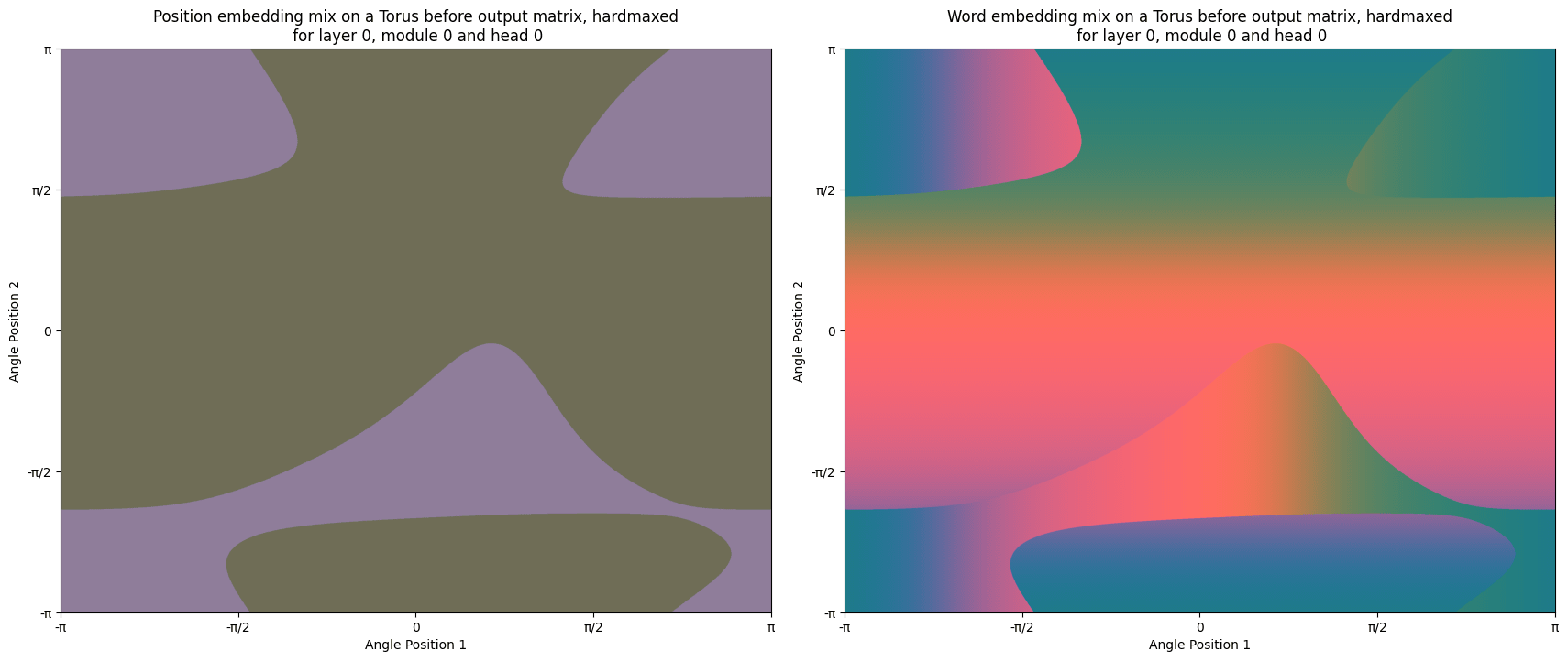 On the left, we have the term depending only on the position $ a_2(e_1, e_2)pos_2+a_1(e_1, e_2)pos_1 $, thus we see a constant color with edges defined by the hardmax of the attention pattern. On the right, $ a_2(e_1, e_2)pos_2+a_1(e_1, e_2)pos_1 $, the plot has the same edges but the colors vary periodically. Note that the colors used for both angles are the same since the vectors themselves are the same. Replacing the hardmax with the softmax will just make the transition smoother at the edges. We finish by adding together the positional and word maps.